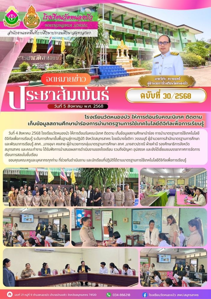 วันที่ 4 สิงหาคม 2568 โรงเรียนวัดหนองบัว ให้การต้อนรับคณะนิเทศ ติดตาม เก็บข้อมูลสถานศึกษานำร่อง การนำมาตรฐานการใช้เทคโนโลยีดิจิทัลเพื่อการเรียนรู้ ระดับการศึกษาขั้นพื้นฐานสู่การปฏิบัติ จังหวัดสมุทรสาคร โดยมีนางโชติกา วรรณบุรี ผู้อำนวยการสำนักมาตรฐานการศึกษาและพัฒนาการเรียนรู้ สกศ. ,นางอุษา คงสาย ผู้อำนวยการกลุ่มมาตรฐานการศึกษา สกศ ,นางสาวปราณี ฝ่ายคำมี รองศึกษาธิการจังหวัดสมุทรสาคร และคณะทำงาน ได้รับฟังการนำเสนอผลการดำเนินงานของโรงเรียน รวมถึงปัญหา อุปสรรค และยังได้เยี่ยมชมบรรยากาศการจัดการเรียนการสอนในชั้นเรียน ขอบคุณคณะครูและบุคลากรทุกท่าน ที่ช่วยกันดำเนินงาน และนักเรียนที่ปฏิบัติได้ตามมาตรฐานการใช้เทคโนโลยีดิจิทัลเพื่อการเรียนรู้